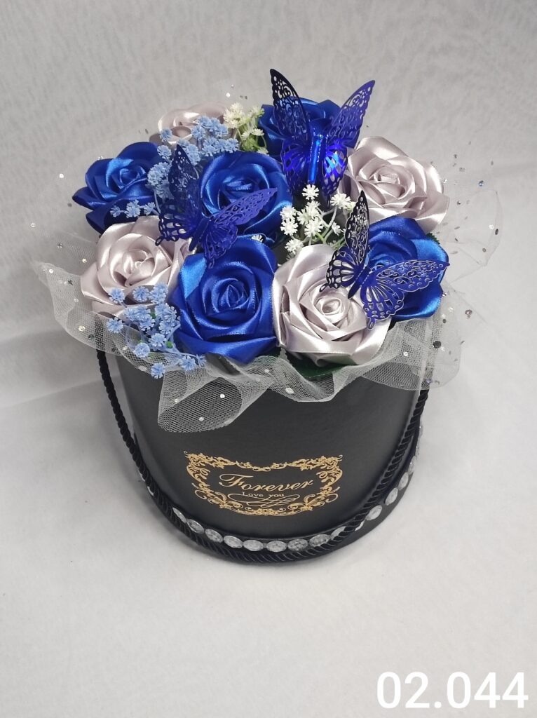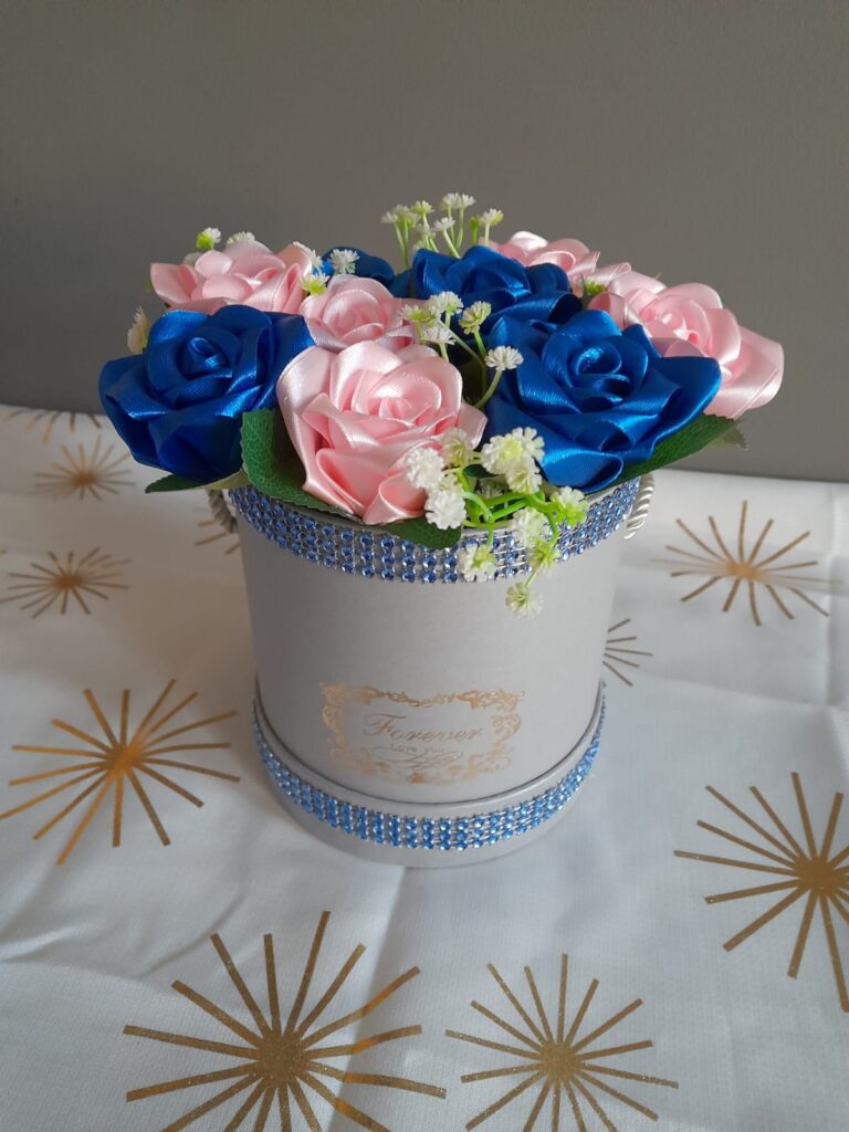 Wyjątkowy Flower Box z Różami w odcieniach niebiesko i szarym to połączenie stylu, elegancji i nowoczesnego designu. Ręcznie wykonane kwiaty z satynowych wstążek zostały starannie ułożone z delikatną koronką, tworząc efektowną i trwałą dekorację.