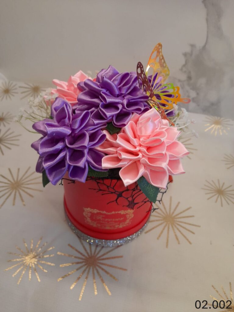 Zachwycający Flower Box z fioletowo-różowych dali to elegancka kompozycja kwiatowa, która wnosi do wnętrza radość, kolor i wyjątkowy urok. Ręcznie wykonane kwiaty z satynowych wstążek zostały umieszczone w czerwonym pudełku ozdobionym delikatnym brokatowym paskiem i motylkiem, dodającym całości lekkości i finezji.