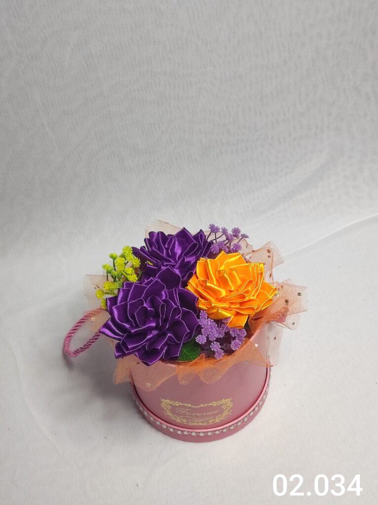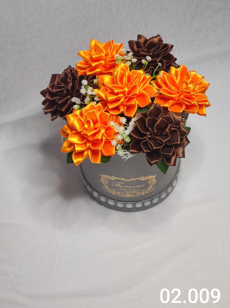Wyjątkowy Flower Box z Daliami w odcieniach c.fioletowym i pomarańczowym to połączenie stylu, elegancji i nowoczesnego designu. Ręcznie wykonane kwiaty z satynowych wstążek zostały starannie ułożone z delikatną koronką, tworząc efektowną i trwałą dekorację.
