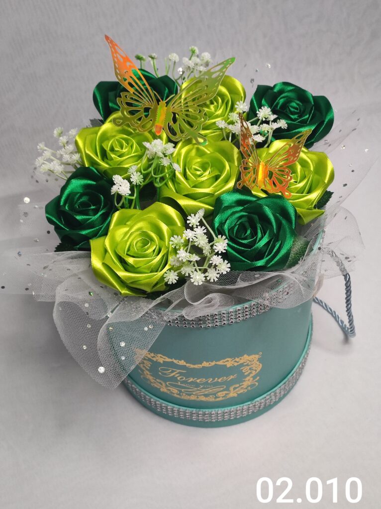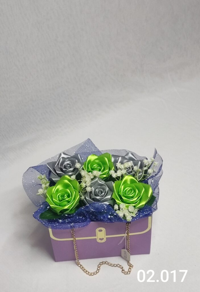 Wyjątkowy Flower Box z Różami w dwóch odcieniach zieleni to połączenie stylu, elegancji i nowoczesnego designu. Ręcznie wykonane kwiaty z satynowych wstążek zostały starannie ułożone w eleganckiej czarnej torebce ozdobionej łańcuszkiem i delikatną koronką, tworząc efektowną i trwałą dekorację.