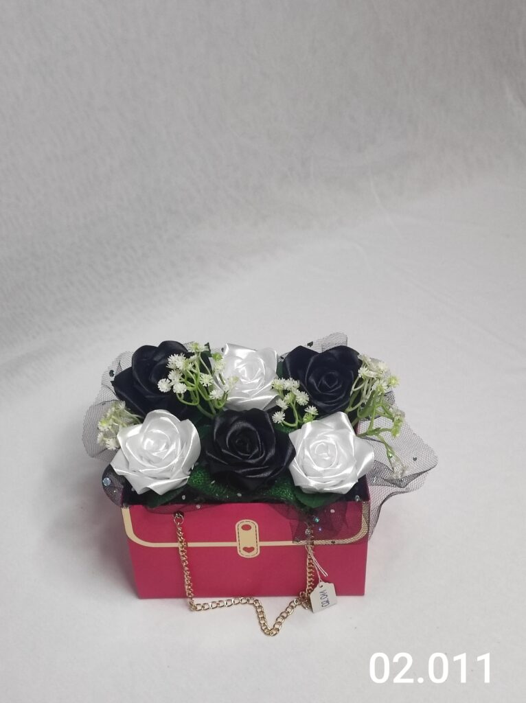 Wyjątkowy Flower Box z Różami w odcieniach czerni i bieli to połączenie stylu, elegancji i nowoczesnego designu. Ręcznie wykonane kwiaty z satynowych wstążek zostały starannie ułożone w eleganckiej różowej torebce ozdobionej łańcuszkiem i delikatną koronką, tworząc efektowną i trwałą dekorację.