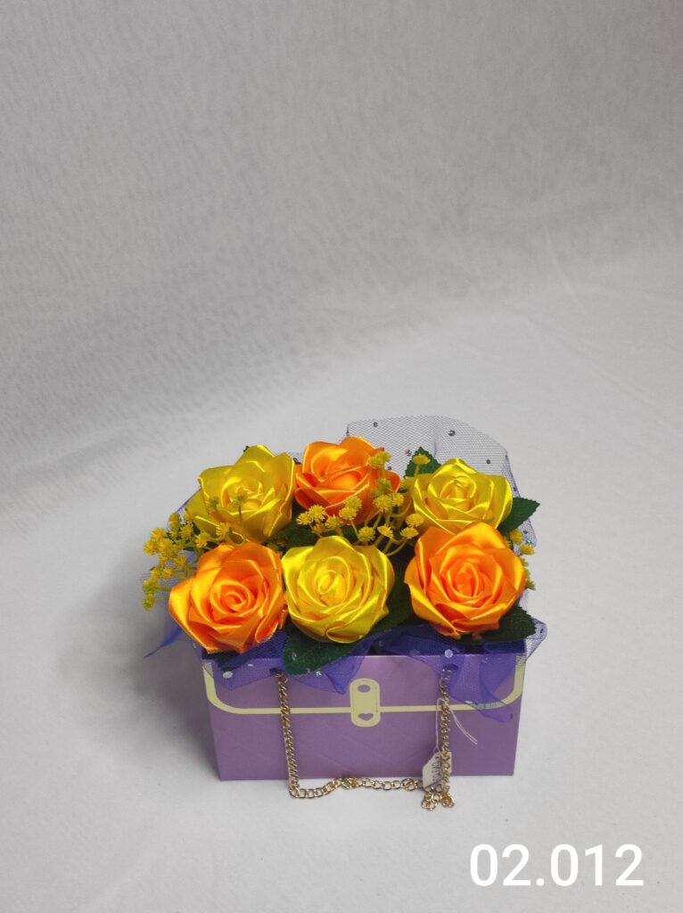 Wyjątkowy Flower Box z Różami w odcieniach pomarańczowo żółtym to połączenie stylu, elegancji i nowoczesnego designu. Ręcznie wykonane kwiaty z satynowych wstążek zostały starannie ułożone w eleganckiej fioletowej torebce ozdobionej łańcuszkiem i delikatną koronką, tworząc efektowną i trwałą dekorację.