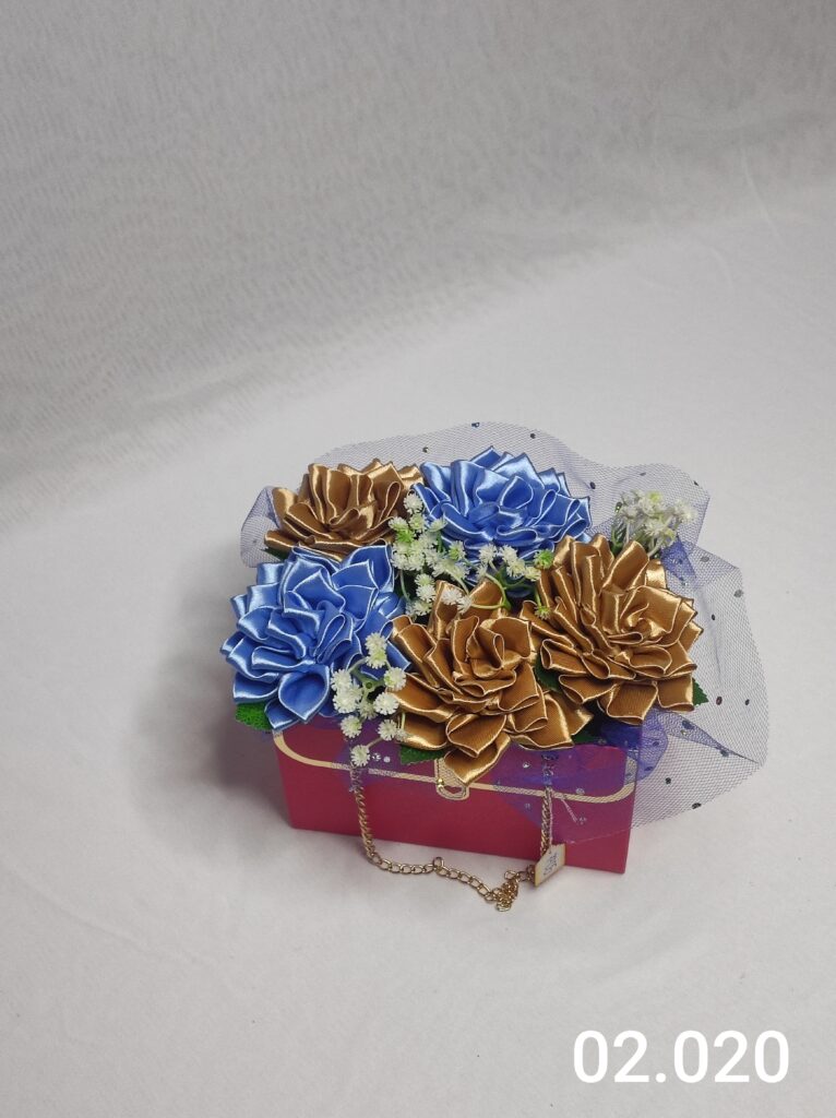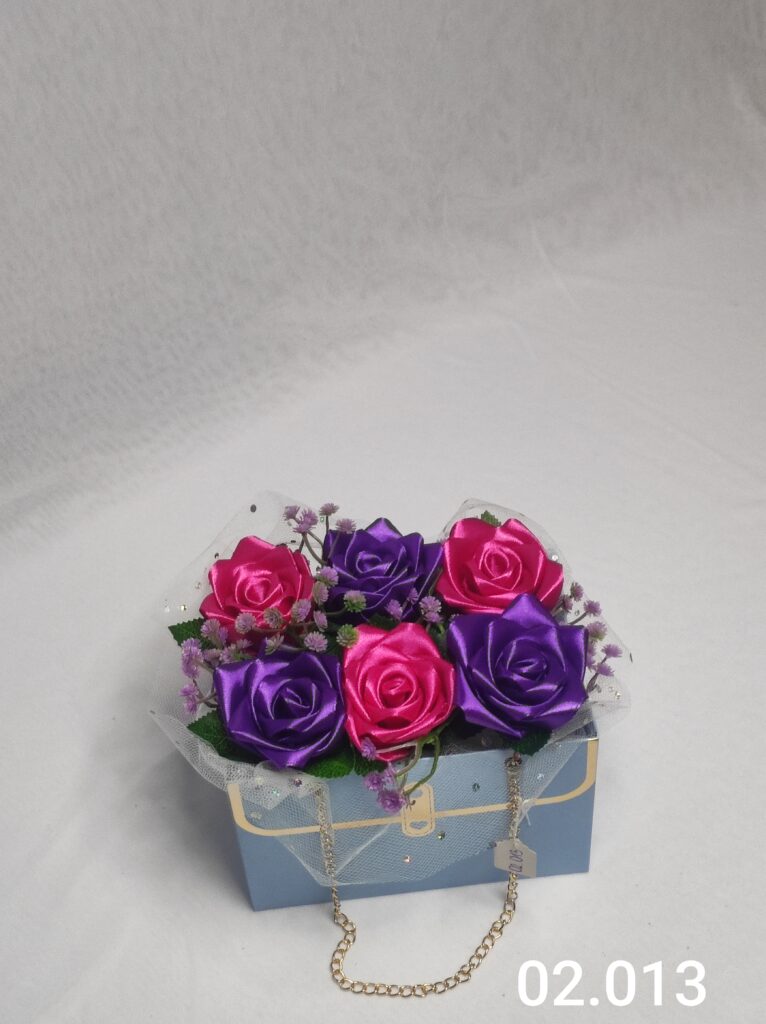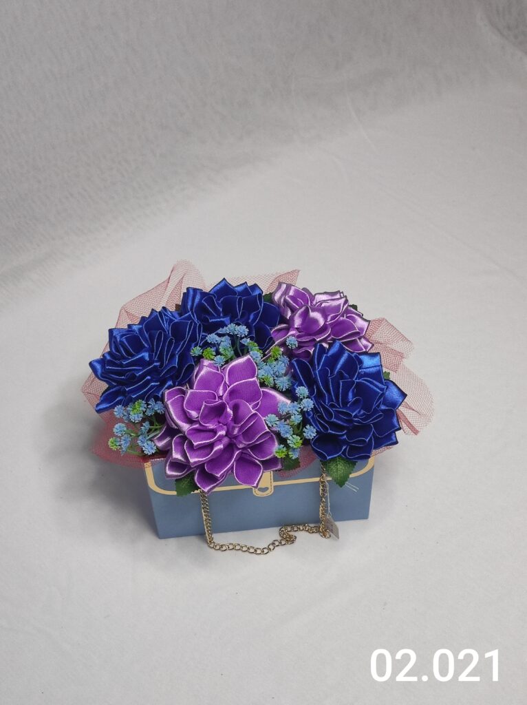 Wyjątkowy Flower Box z Różami w odcieniach fioletu i różu to połączenie stylu, elegancji i nowoczesnego designu. Ręcznie wykonane kwiaty z satynowych wstążek zostały starannie ułożone w eleganckiej niebieskiej torebce ozdobionej łańcuszkiem i delikatną koronką, tworząc efektowną i trwałą dekorację.