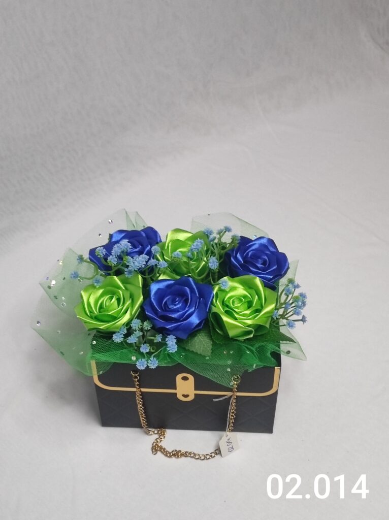 Wyjątkowy Flower Box z Różami w odcieniach zieleni i niebieskiego to połączenie stylu, elegancji i nowoczesnego designu. Ręcznie wykonane kwiaty z satynowych wstążek zostały starannie ułożone w eleganckiej czarnej torebce ozdobionej łańcuszkiem i delikatną koronką, tworząc efektowną i trwałą dekorację.