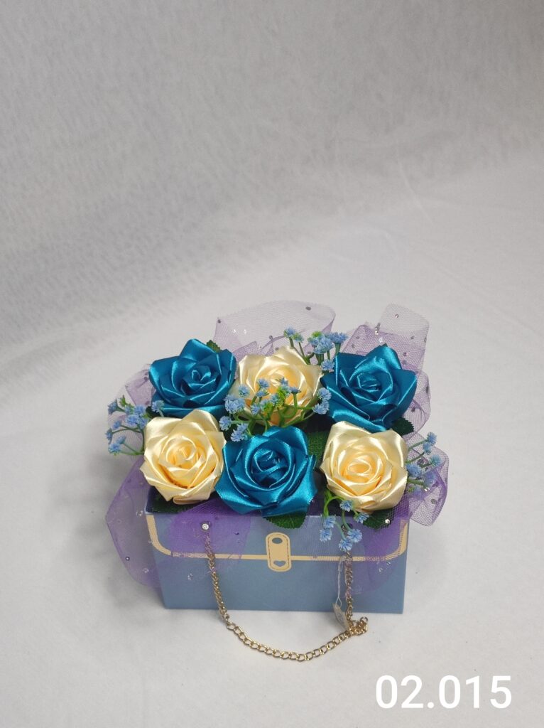 Wyjątkowy Flower Box z Różami w odcieniach kremowego i niebieskiego to połączenie stylu, elegancji i nowoczesnego designu. Ręcznie wykonane kwiaty z satynowych wstążek zostały starannie ułożone w eleganckiej niebieskiej torebce ozdobionej łańcuszkiem i delikatną koronką, tworząc efektowną i trwałą dekorację.