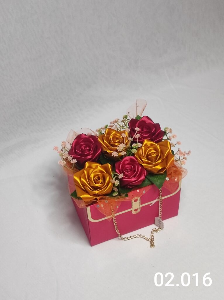 Wyjątkowy Flower Box z Różami w odcieniach złotego i czerwieni to połączenie stylu, elegancji i nowoczesnego designu. Ręcznie wykonane kwiaty z satynowych wstążek zostały starannie ułożone w eleganckiej różowej i delikatną koronką, tworząc efektowną i trwałą dekorację.