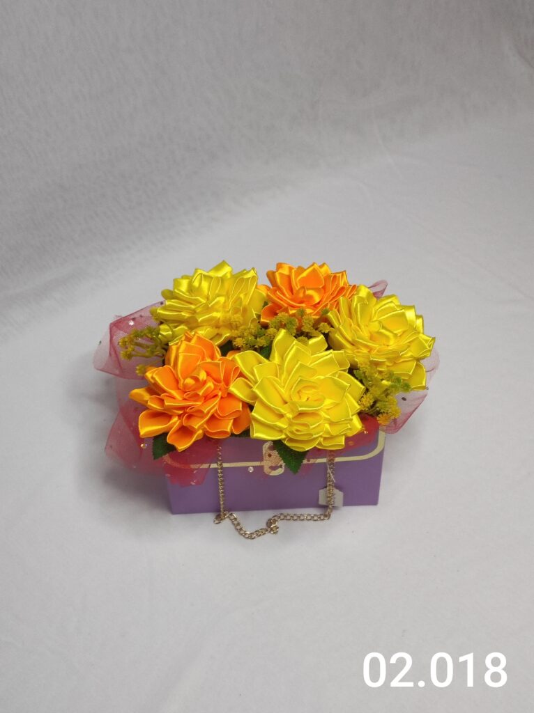 Wyjątkowy Flower Box z Daliami w odcieniach żółtego i pomarańczowego to połączenie stylu, elegancji i nowoczesnego designu. Ręcznie wykonane kwiaty z satynowych wstążek zostały starannie ułożone w eleganckiej fioletowej i delikatną koronką, tworząc efektowną i trwałą dekorację.