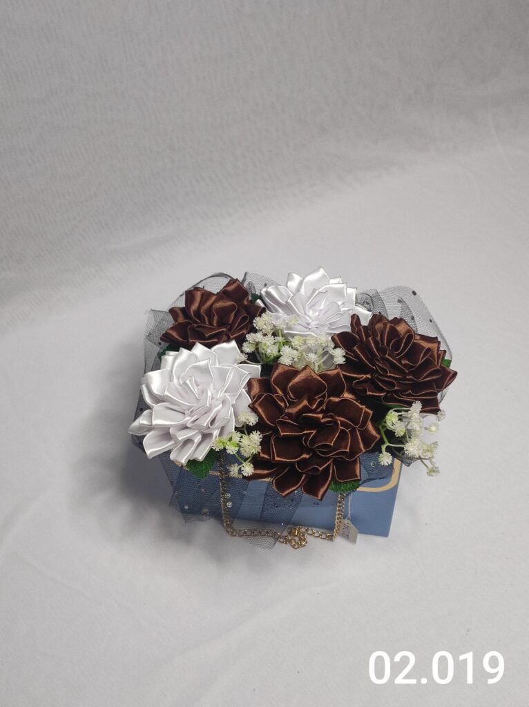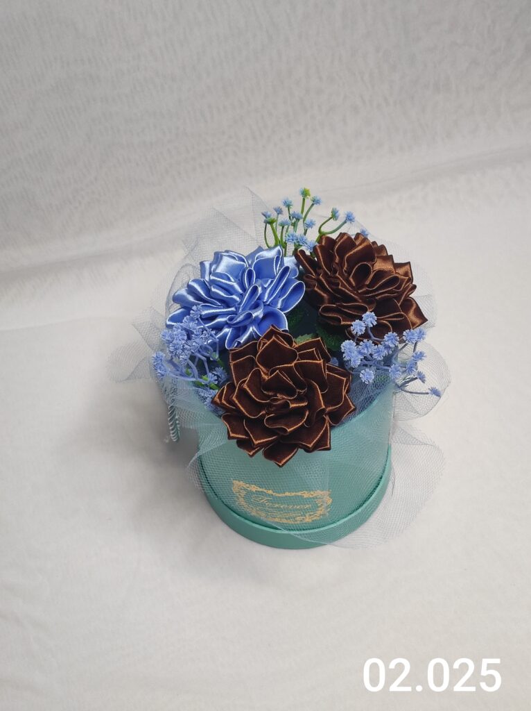Wyjątkowy Flower Box z Daliami w odcieniach brązu i bieli to połączenie stylu, elegancji i nowoczesnego designu. Ręcznie wykonane kwiaty z satynowych wstążek zostały starannie ułożone w eleganckiej niebieskiej i delikatną koronką, tworząc efektowną i trwałą dekorację.
