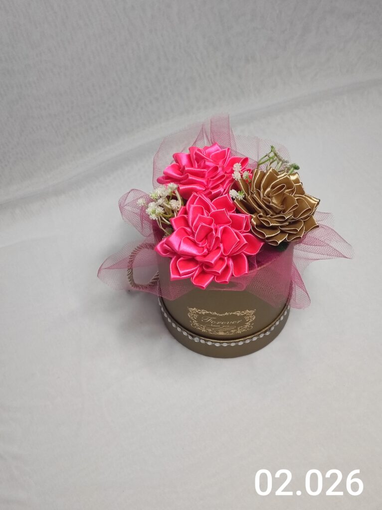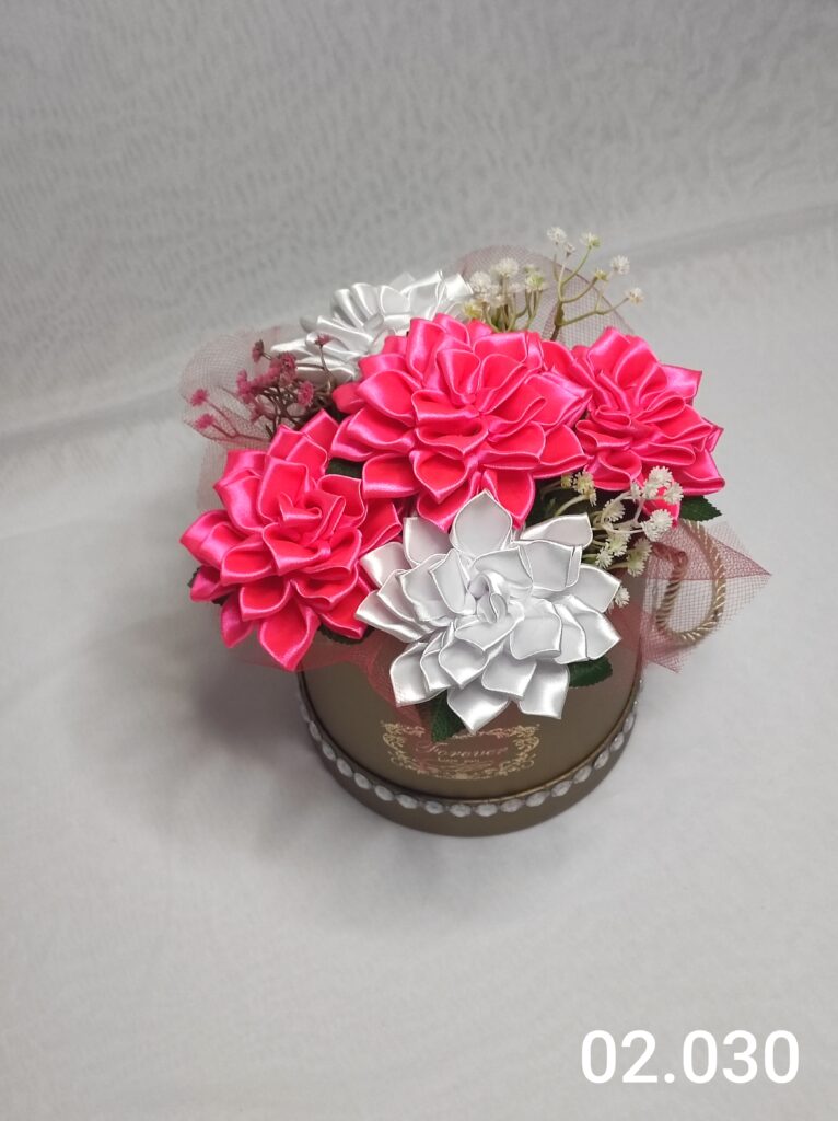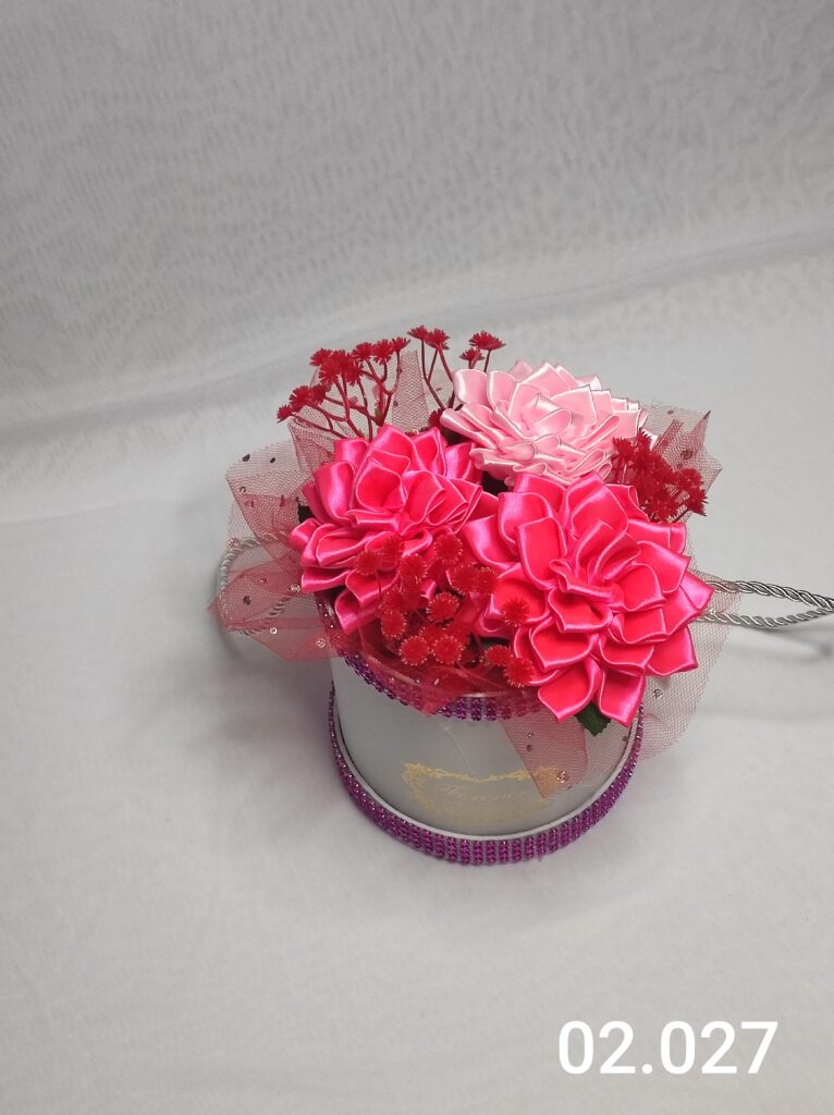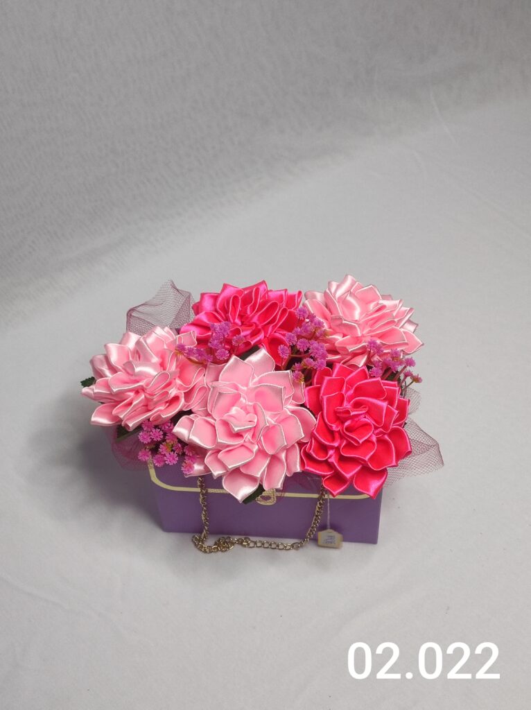 Wyjątkowy Flower Box z Daliami w dwóch odcieniach różu to połączenie stylu, elegancji i nowoczesnego designu. Ręcznie wykonane kwiaty z satynowych wstążek zostały starannie ułożone z delikatną koronką, tworząc efektowną i trwałą dekorację.