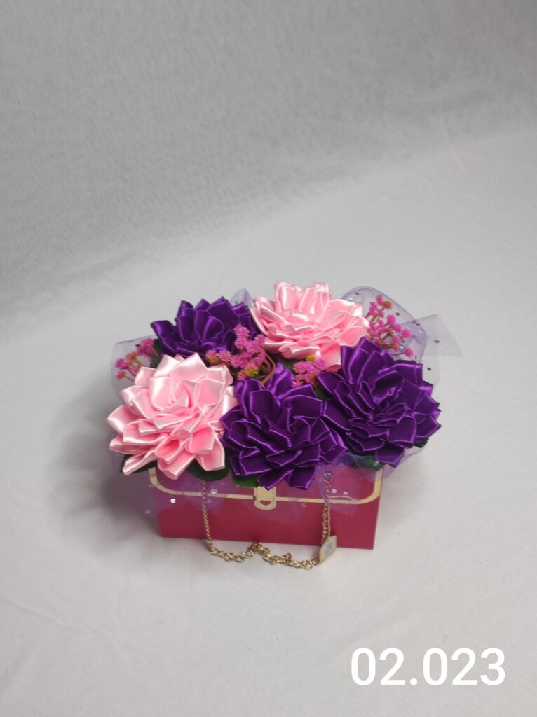 Wyjątkowy Flower Box z Daliami w dwóch odcieniach różu to połączenie stylu, elegancji i nowoczesnego designu. Ręcznie wykonane kwiaty z satynowych wstążek zostały starannie ułożone w eleganckiej fioletowej i delikatną koronką, tworząc efektowną i trwałą dekorację.