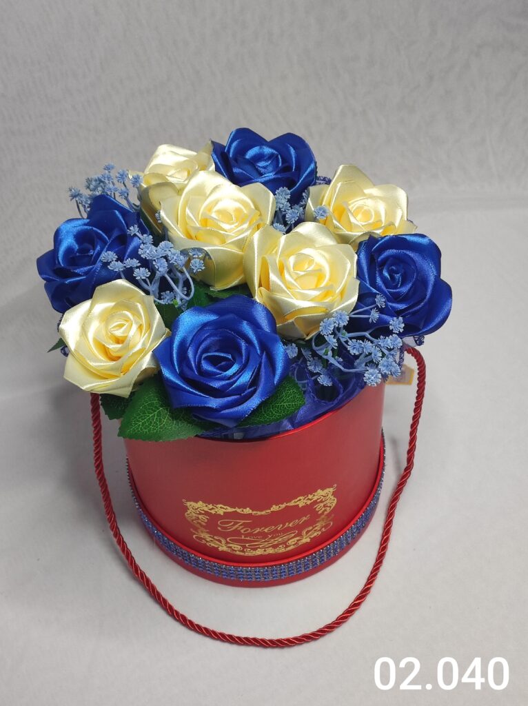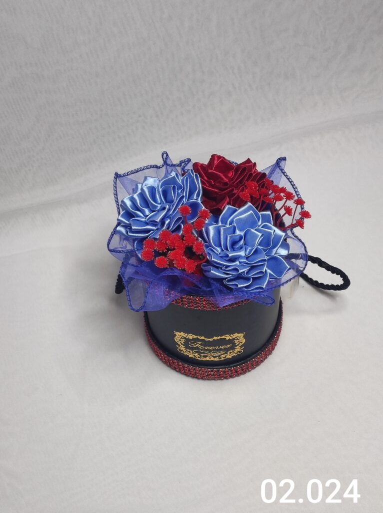 Wyjątkowy Flower Box z Daliami w odcieniach j.niebieski i czerwony to połączenie stylu, elegancji i nowoczesnego designu. Ręcznie wykonane kwiaty z satynowych wstążek zostały starannie ułożone z delikatną koronką, tworząc efektowną i trwałą dekorację.
