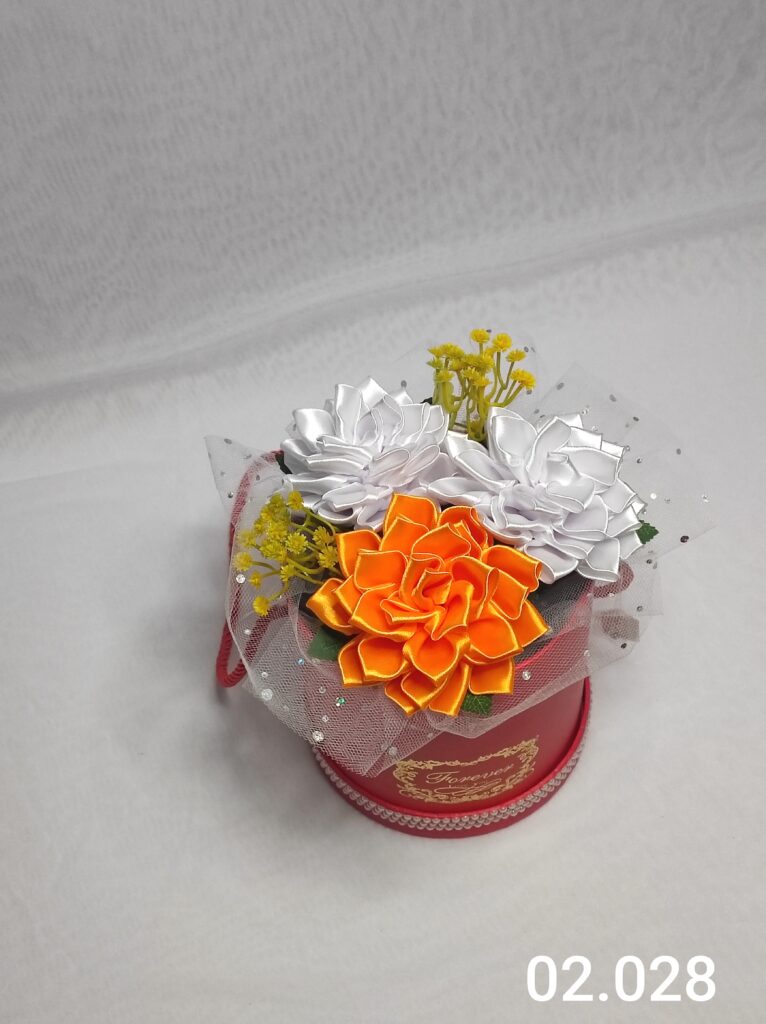 Wyjątkowy Flower Box z Daliami w odcieniach bieli i pomarańczy to połączenie stylu, elegancji i nowoczesnego designu. Ręcznie wykonane kwiaty z satynowych wstążek zostały starannie ułożone z delikatną koronką, tworząc efektowną i trwałą dekorację.