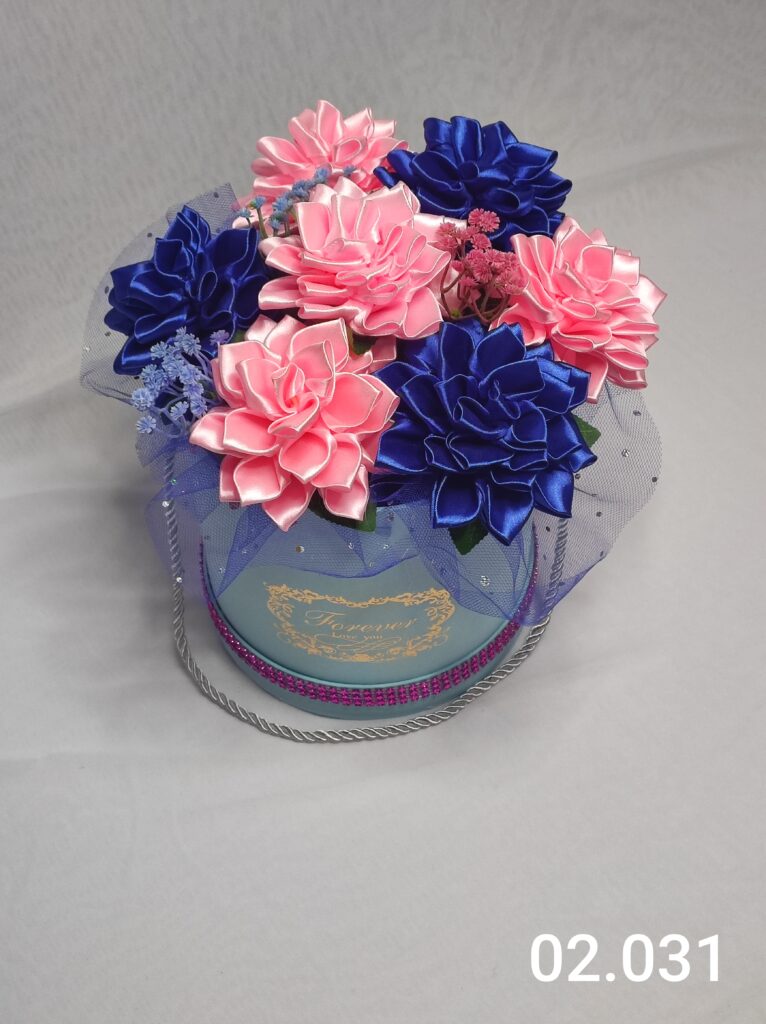 Wyjątkowy Flower Box z Daliami w odcieniach j.różu i c.niebieskim to połączenie stylu, elegancji i nowoczesnego designu. Ręcznie wykonane kwiaty z satynowych wstążek zostały starannie ułożone z delikatną koronką, tworząc efektowną i trwałą dekorację.