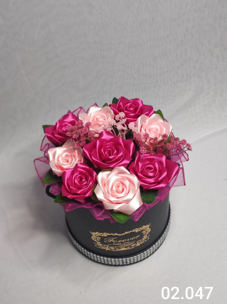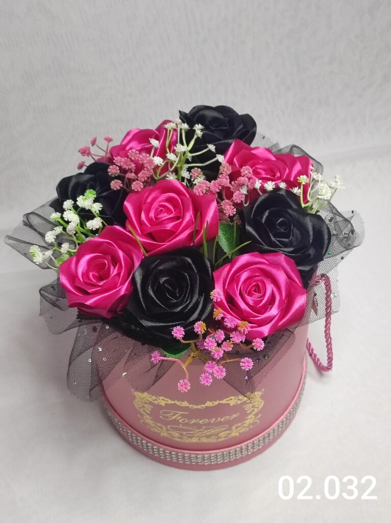 Wyjątkowy Flower Box z Różamii w odcieniach różowo czarnym to połączenie stylu, elegancji i nowoczesnego designu. Ręcznie wykonane kwiaty z satynowych wstążek zostały starannie ułożone z delikatną koronką, tworząc efektowną i trwałą dekorację.