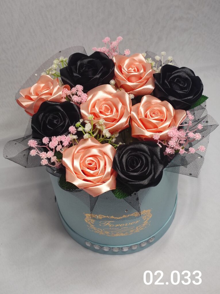Wyjątkowy Flower Box z Różamii w odcieniach łososiowo czarnym to połączenie stylu, elegancji i nowoczesnego designu. Ręcznie wykonane kwiaty z satynowych wstążek zostały starannie ułożone z delikatną koronką, tworząc efektowną i trwałą dekorację.