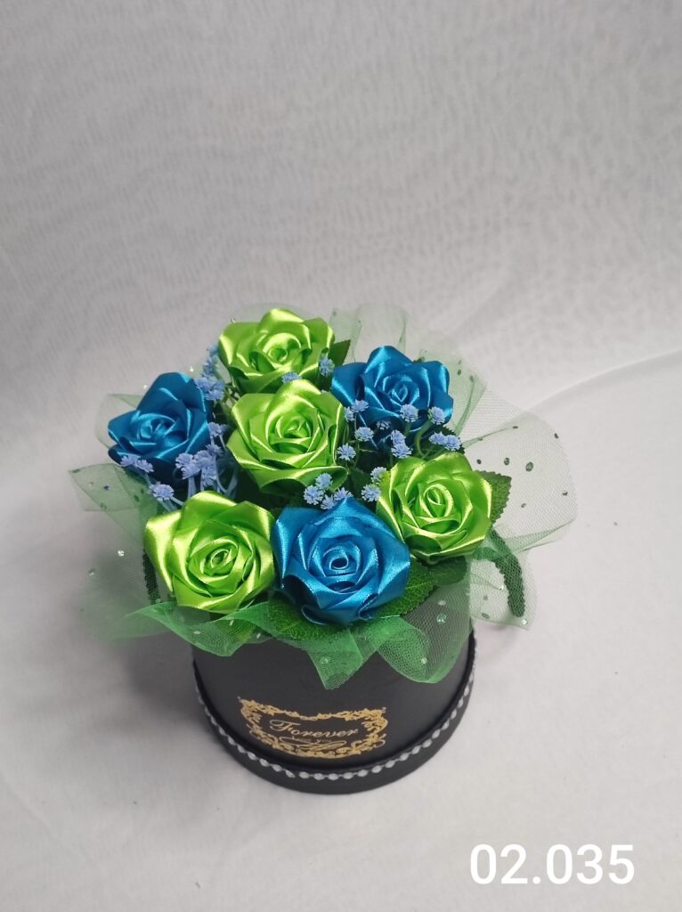 Wyjątkowy Flower Box z Różami w odcieniach zielono turkusowym to połączenie stylu, elegancji i nowoczesnego designu. Ręcznie wykonane kwiaty z satynowych wstążek zostały starannie ułożone z delikatną koronką, tworząc efektowną i trwałą dekorację.