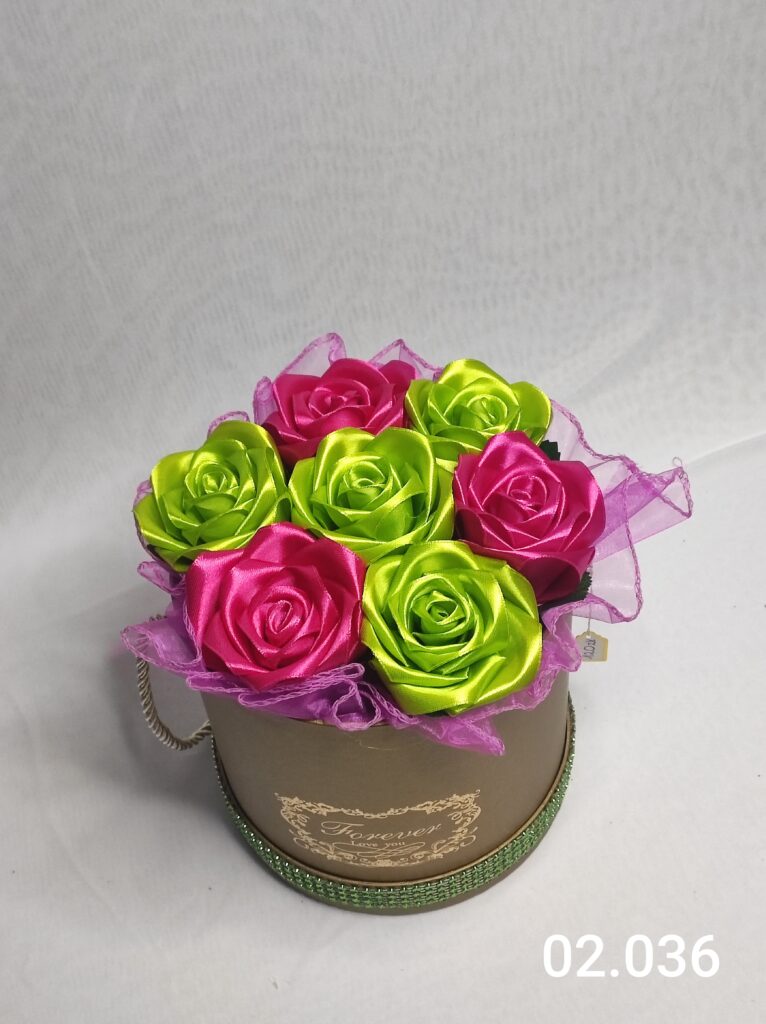 Wyjątkowy Flower Box z Różami w odcieniach zielono różowym to połączenie stylu, elegancji i nowoczesnego designu. Ręcznie wykonane kwiaty z satynowych wstążek zostały starannie ułożone z delikatną koronką, tworząc efektowną i trwałą dekorację.