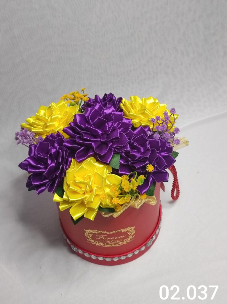 Wyjątkowy Flower Box z Daliami w odcieniach fioletowo żółtym to połączenie stylu, elegancji i nowoczesnego designu. Ręcznie wykonane kwiaty z satynowych wstążek zostały starannie ułożone z delikatną koronką, tworząc efektowną i trwałą dekorację.