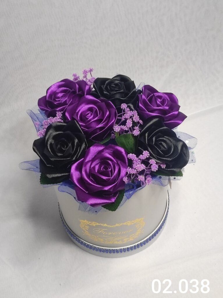 Wyjątkowy Flower Box z Różami w odcieniach fioletowo czarnym to połączenie stylu, elegancji i nowoczesnego designu. Ręcznie wykonane kwiaty z satynowych wstążek zostały starannie ułożone z delikatną koronką, tworząc efektowną i trwałą dekorację.