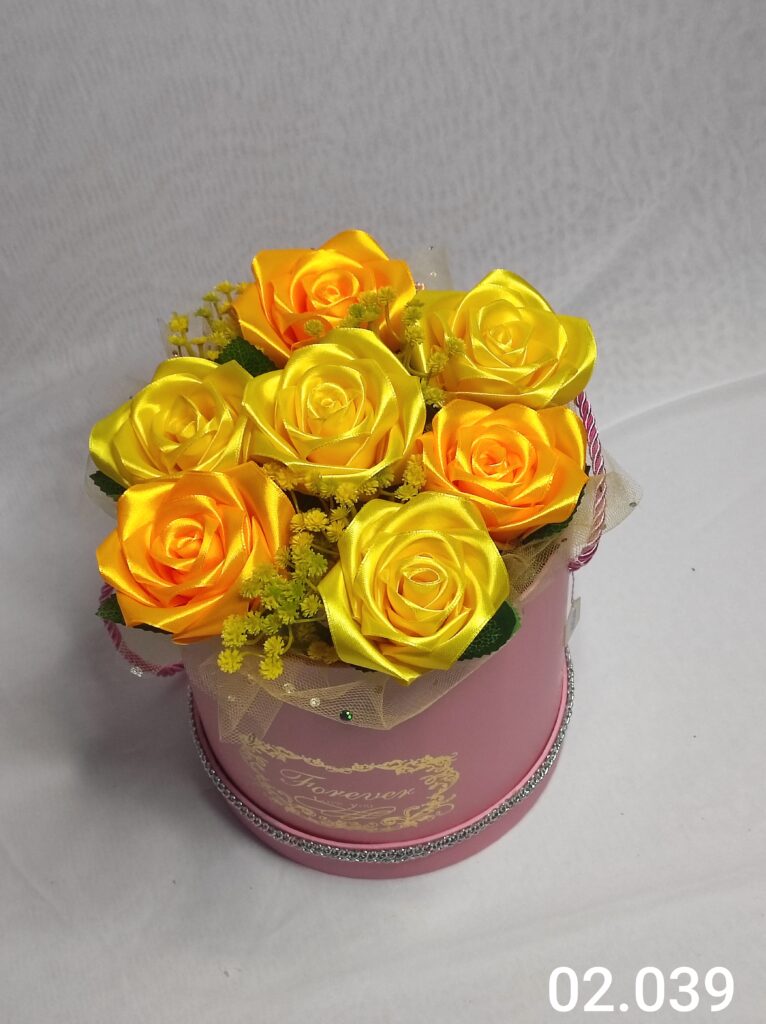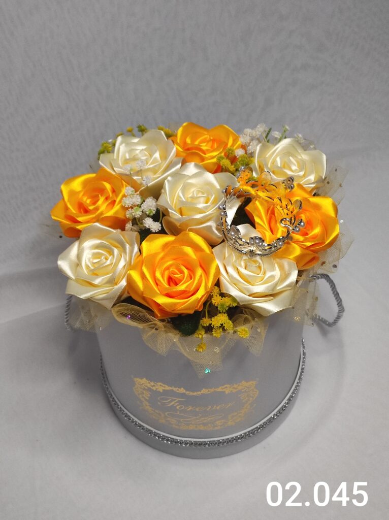 Wyjątkowy Flower Box z Różami w odcieniach żółto pomarańczowym to połączenie stylu, elegancji i nowoczesnego designu. Ręcznie wykonane kwiaty z satynowych wstążek zostały starannie ułożone z delikatną koronką, tworząc efektowną i trwałą dekorację.
