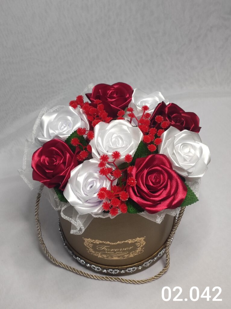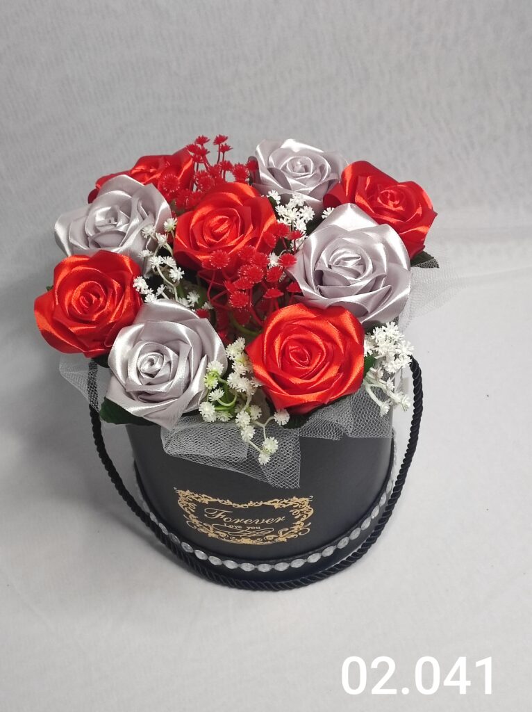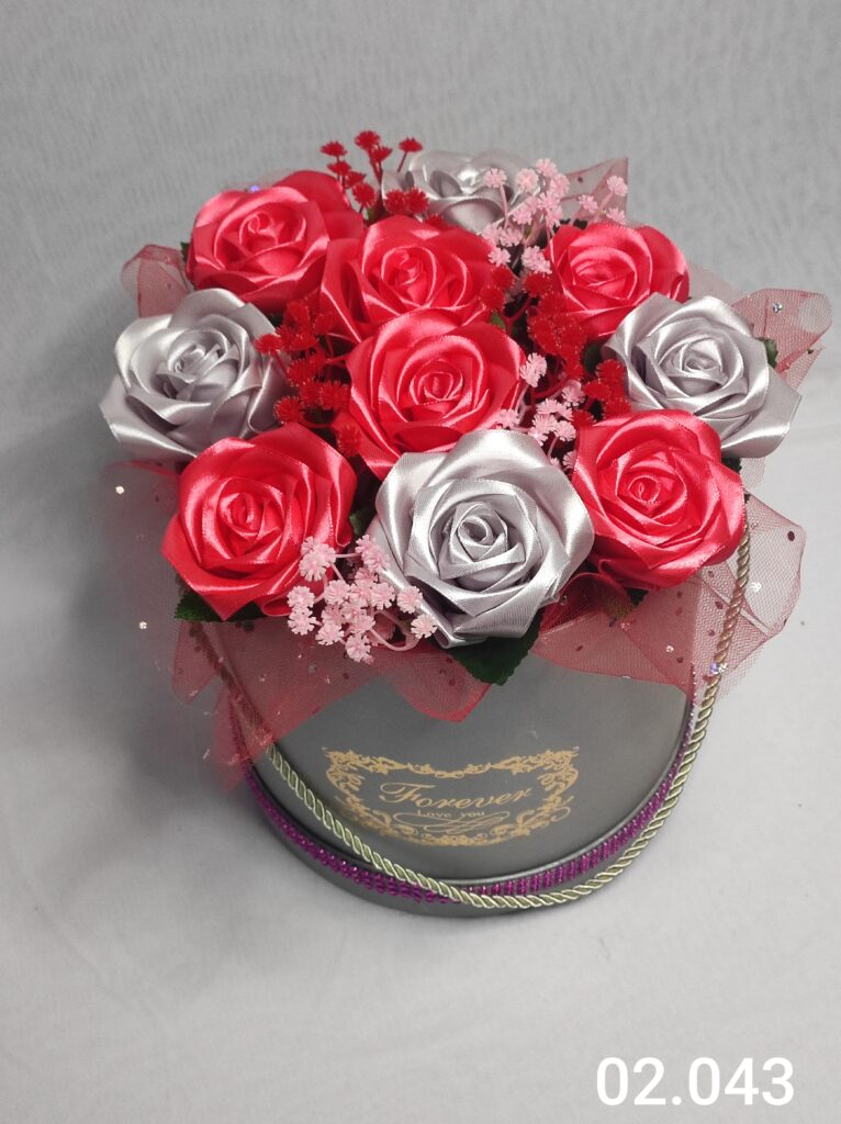 Wyjątkowy Flower Box z Różami w odcieniach j. czerwono szarym to połączenie stylu, elegancji i nowoczesnego designu. Ręcznie wykonane kwiaty z satynowych wstążek zostały starannie ułożone z delikatną koronką, tworząc efektowną i trwałą dekorację.