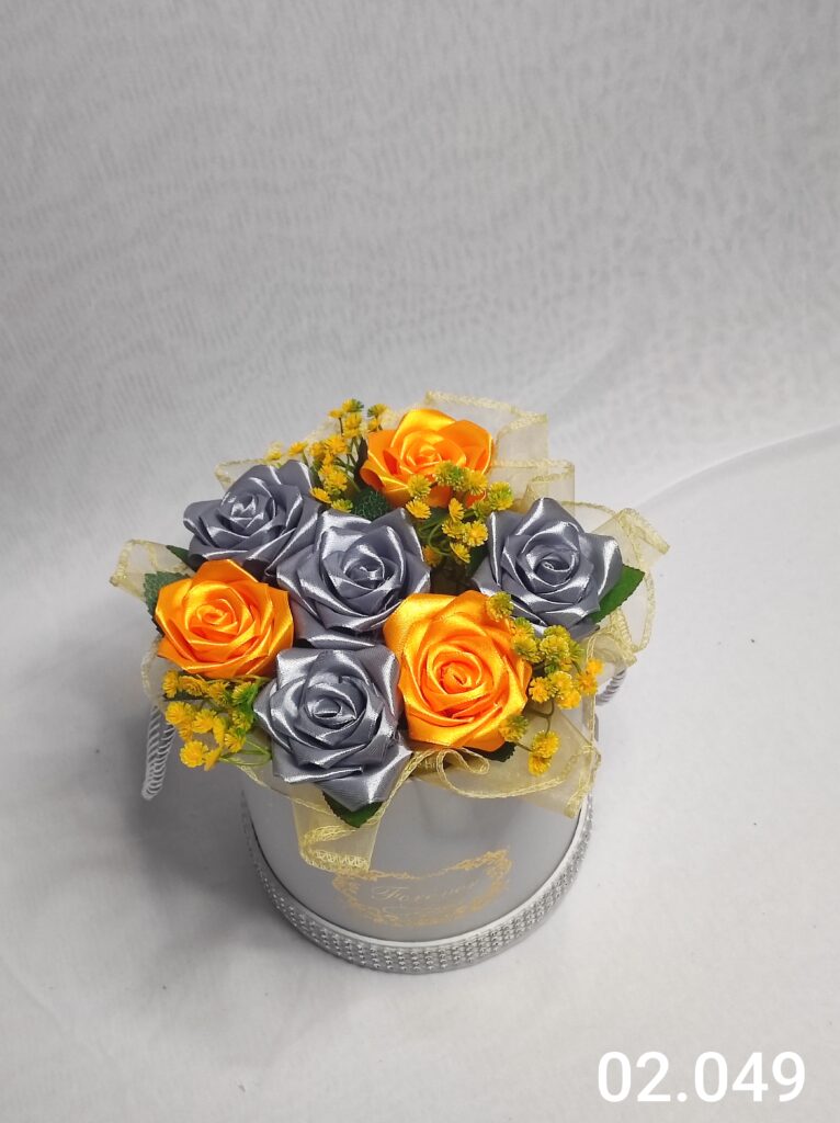 Wyjątkowy Flower Box z Różami w odcieniach szaro pomarańczowo to połączenie stylu, elegancji i nowoczesnego designu. Ręcznie wykonane kwiaty z satynowych wstążek zostały starannie ułożone z delikatną koronką, tworząc efektowną i trwałą dekorację.